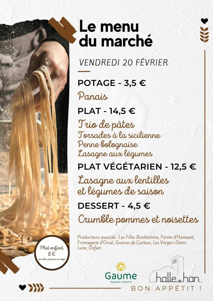 Le Marché de la Halle de Han (Tintigny) invite chaque semaine des producteurs locaux à rencontrer leurs clients en circuit court. Durant le marché, notre Entreprise de formation par le travail (EFT) propose un menu, à déguster dans la partie restaurant ou à emporter, réalisé par les stagiaires en formation, avec des produits locaux.