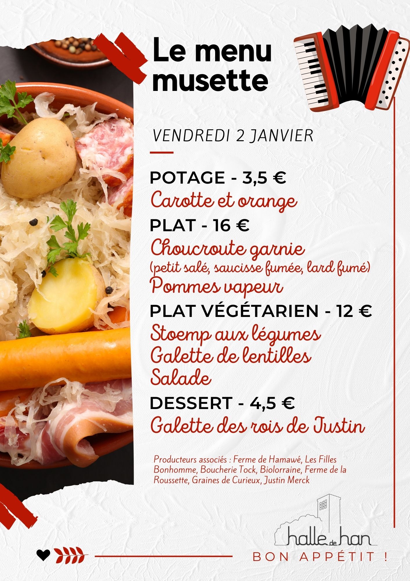 Les traditions, parfois, ça a du bon ! Ce 2 janvier, venez refaire votre flore intestinale avec la choucroute de la ferme d’Hamawé et faire le plein d’ambiance avec la soirée musette dirigée par Trois Petites Notes.