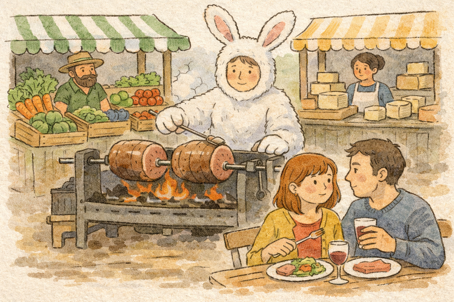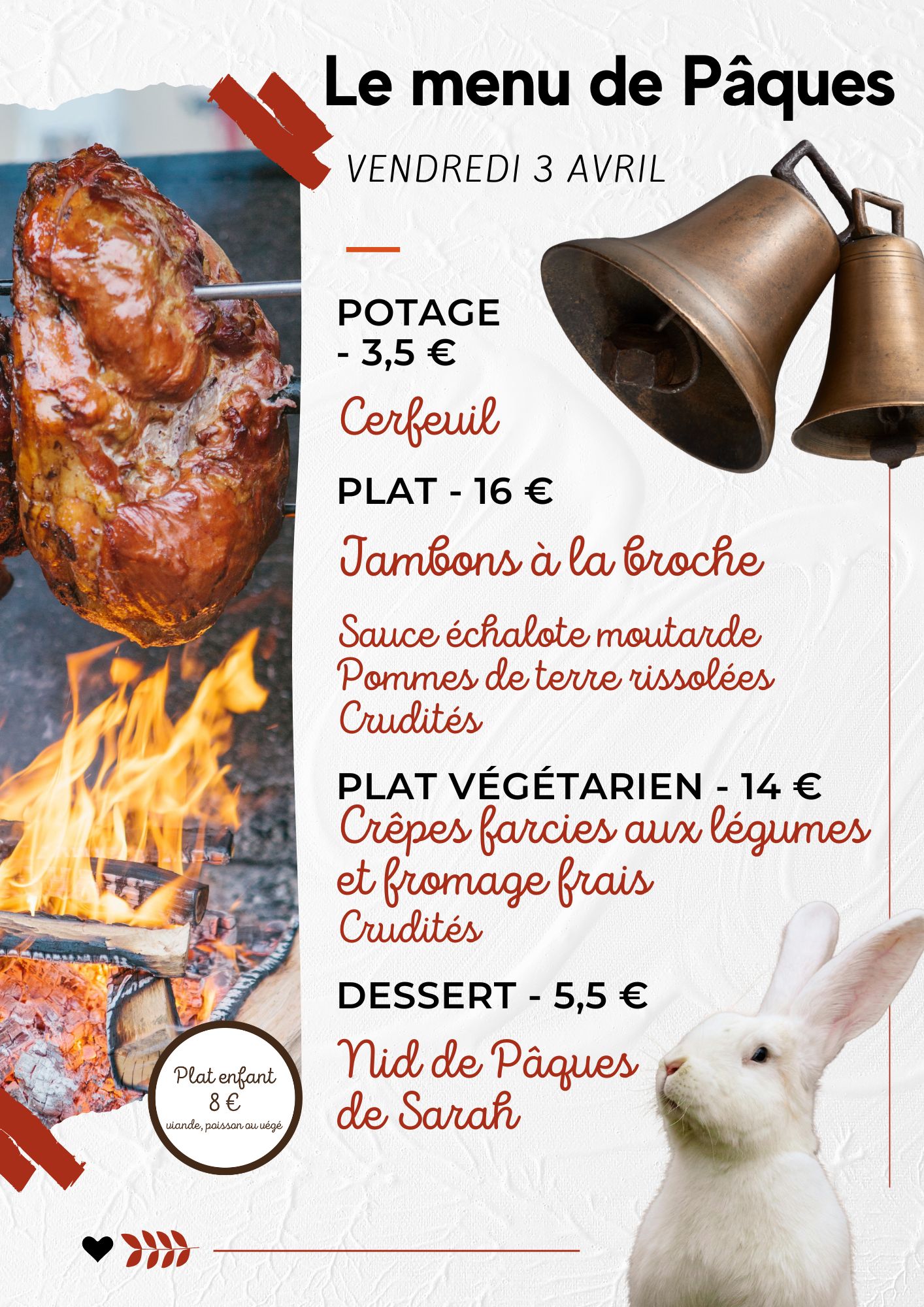 À Pâques, on fête le retour de l’abondance ! Mais comme, début avril, les agneaux sont encore un peu maigrelets, on s’est tourné vers des traditions plus germaniques pour vous proposer du jambon de Pâques ! Cuit à la broche au feu de bois tout l’après-midi, il sera servi encore fumant au restaurant.