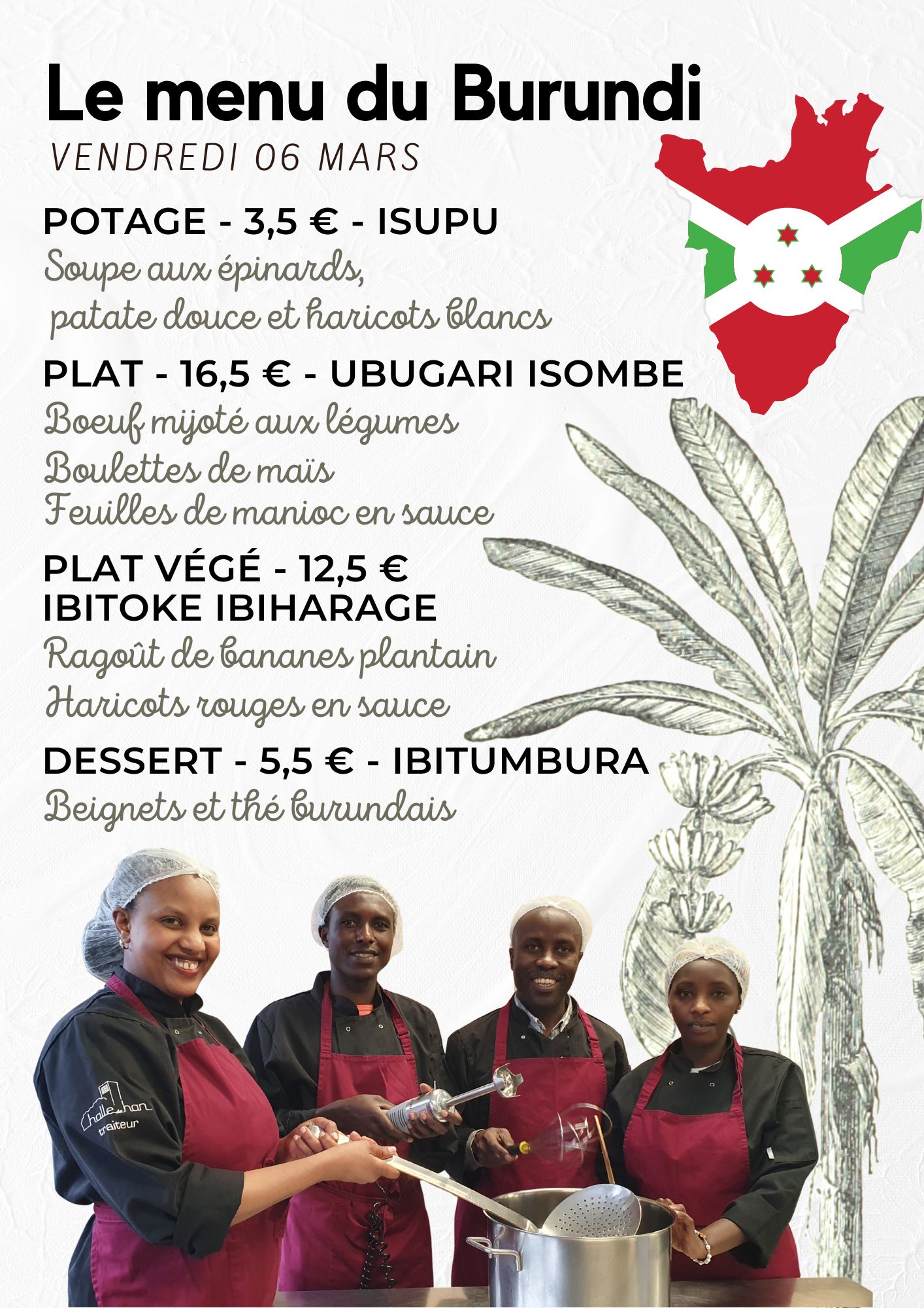 Attendez-vous à du dépaysement avec une soupe à la patate douce et aux épinards, des boulettes de maïs, du boeuf mijoté, des feuilles de manioc en sauce, du ragoût de bananes plantain ou encore du thé du Burundi.