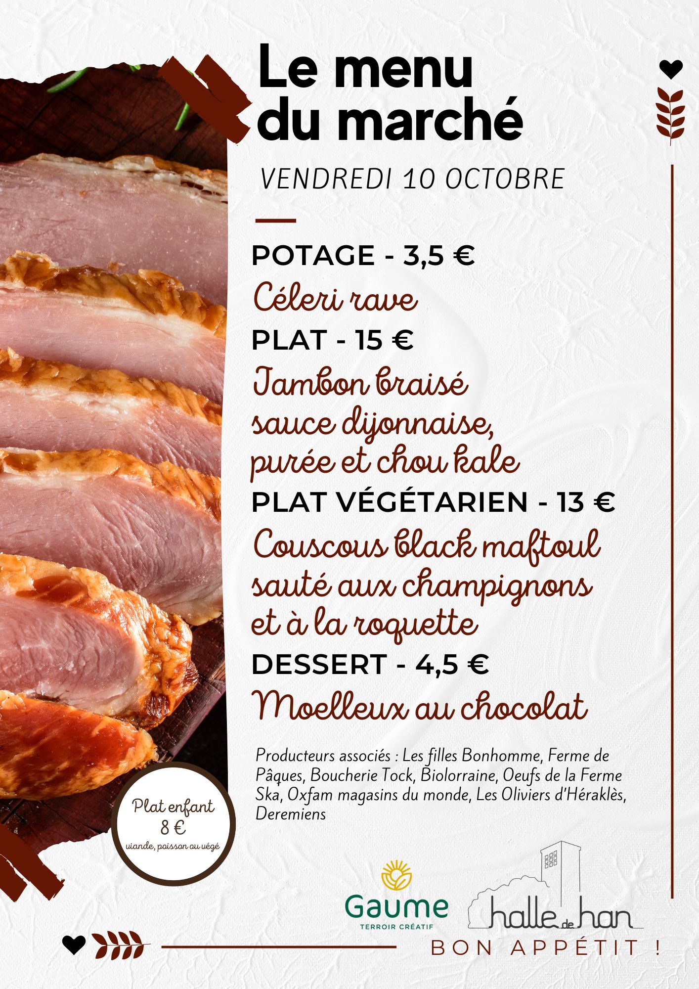 Le céleri rave fait ainsi son retour en soupe. Le jambon braisé s’accompagne des premiers choux kale, revenus au beurre et aux oignons avec une pointe de muscade. Le couscous black maftoul sera, lui, agrémenté de champignons. Et un exquis moelleux au chocolat fera craquer les plus rétifs en fin de repas.