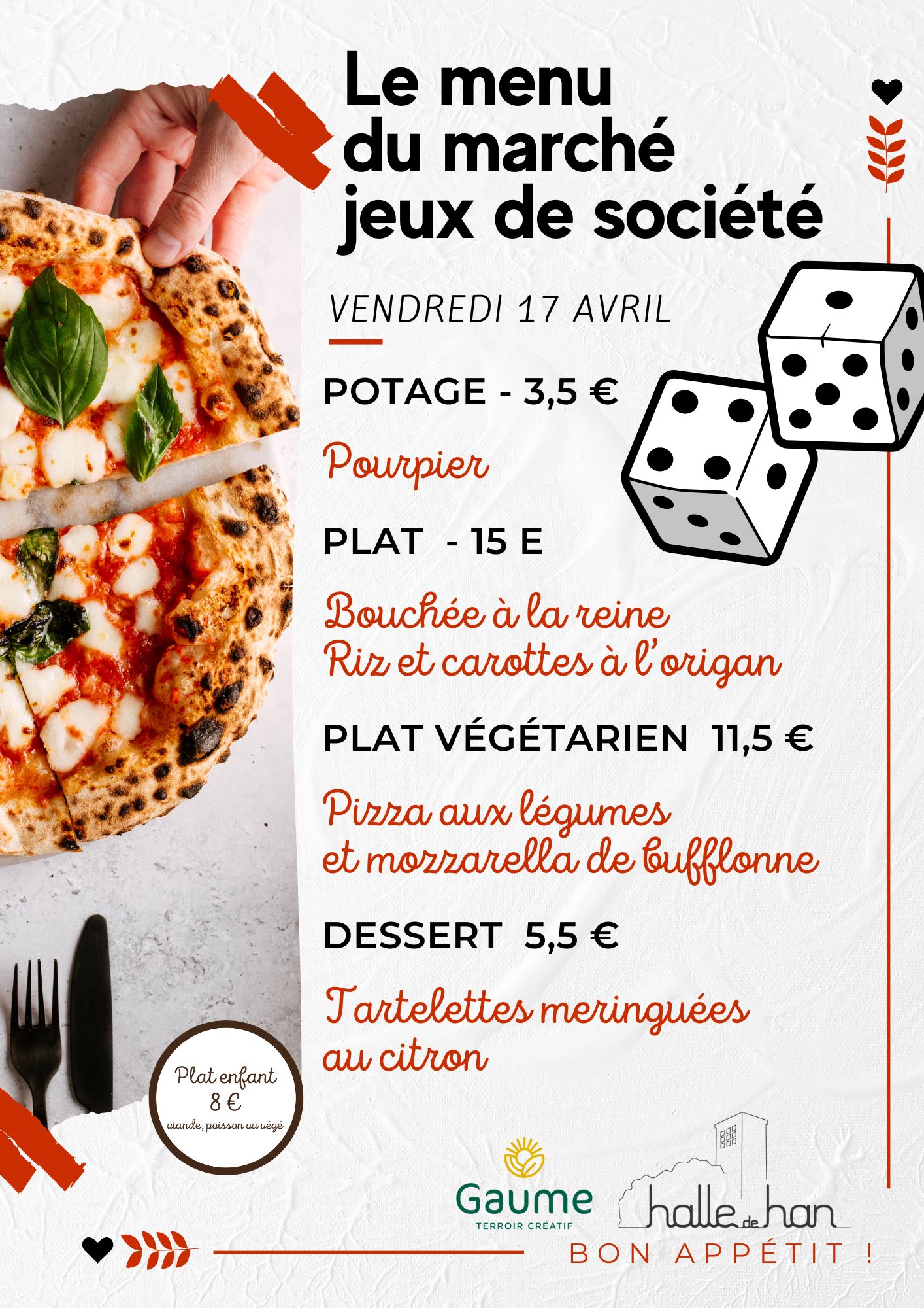 Venez jouer au marché fermier ! Ce 17 avril, la Halle de Han ouvre deux grandes salles avec un maximum de jeux de société, animées par la Ludothèque de Rossignol et la Halle de Han. Classiques, stratégiques, d’ambiance, nouveautés, jeux primés, pour petits ou grands : vous trouverez un large choix de jeux en accès gratuit toute la soirée.