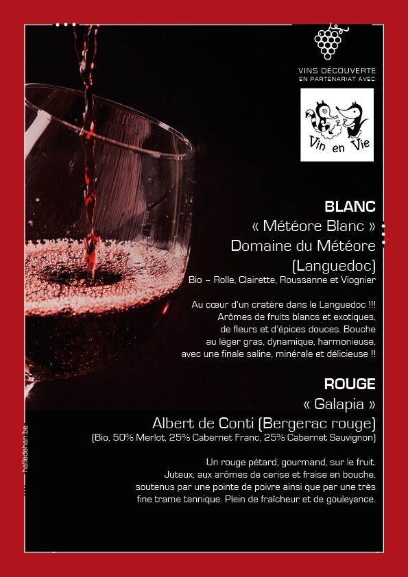 En collaboration avec Vin en Vie (Virton), nous proposons régulièrement de nouveaux vins rouges et blancs à partager au verre ou en bouteille. Souvent naturels ou biodynamiques, loin des clichés vinicoles, ces breuvages goûtent le respect de la terre et cultivent nos papilles !