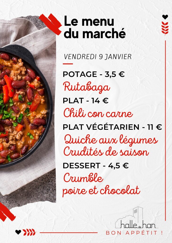 Le Marché de la Halle de Han (Tintigny) invite chaque semaine des producteurs locaux à rencontrer leurs clients en circuit court. Durant le marché, notre Entreprise de formation par le travail (EFT) propose un menu, à déguster dans la partie restaurant ou à emporter, réalisé par les stagiaires en formation, avec des produits locaux.