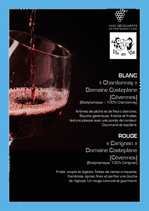 En collaboration avec Vin en Vie (Virton), nous proposons régulièrement de nouveaux vins rouges et blancs à partager au verre ou en bouteille. Souvent naturels ou biodynamiques, loin des clichés vinicoles, ces breuvages goûtent le respect de la terre et cultivent nos papilles !