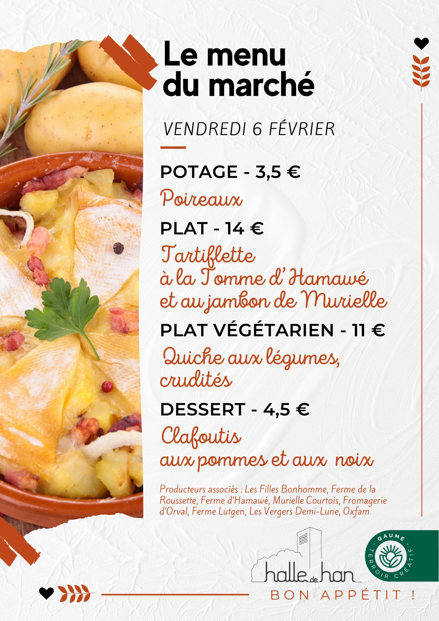 Le Marché de la Halle de Han (Tintigny) invite chaque semaine des producteurs locaux à rencontrer leurs clients en circuit court. Durant le marché, notre Entreprise de formation par le travail (EFT) propose un menu, à déguster dans la partie restaurant ou à emporter, réalisé par les stagiaires en formation, avec des produits locaux.
