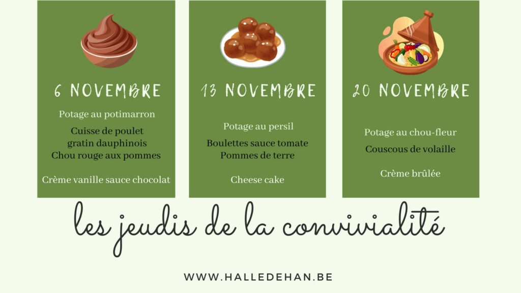 • Réservez votre menu la veille avant minuit par e-mail : halle @ halledehan.be ou par téléphone au 063 44 00 60