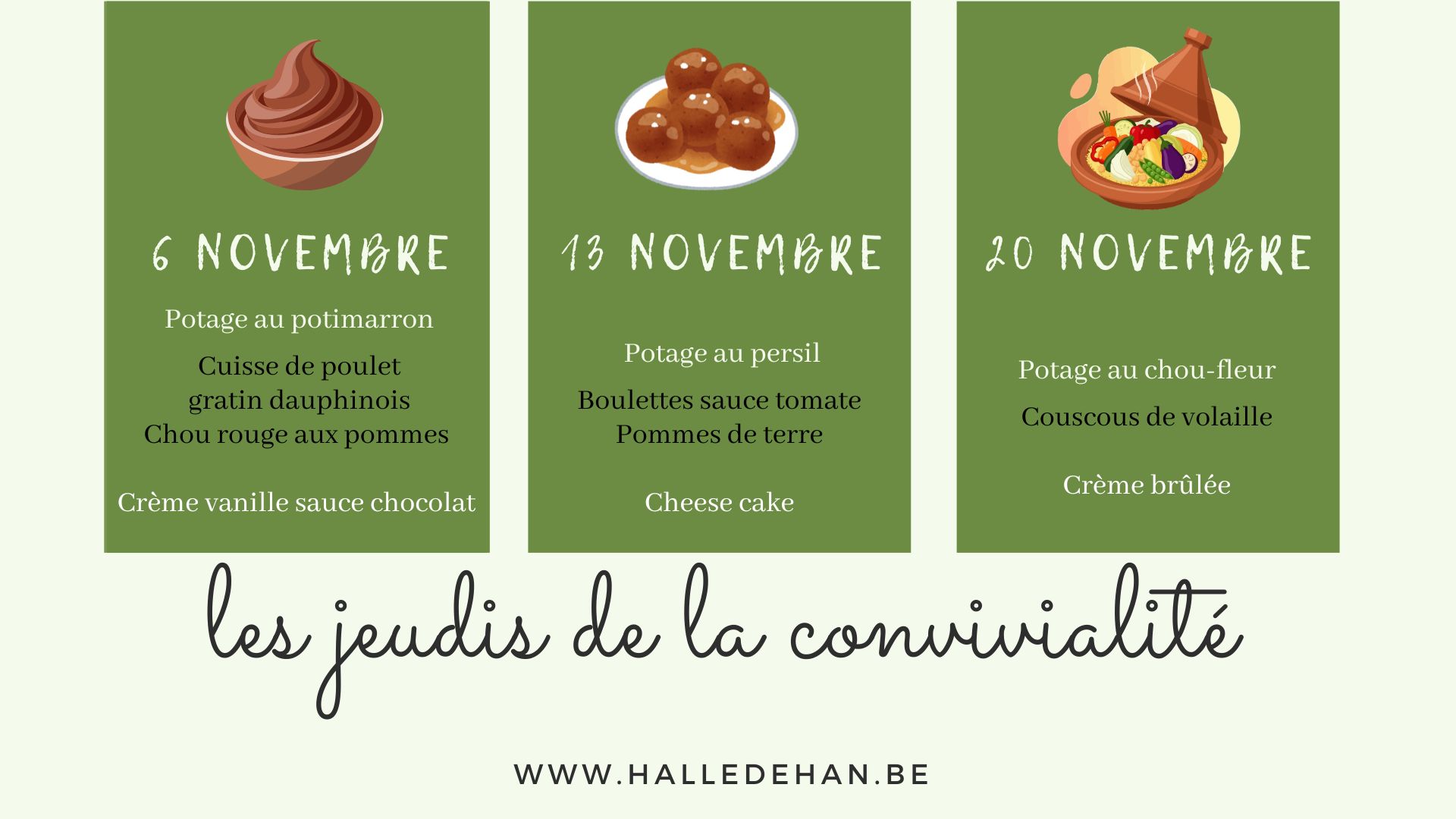 • Réservez votre menu la veille avant minuit par e-mail : halle @ halledehan.be ou par téléphone au 063 44 00 60