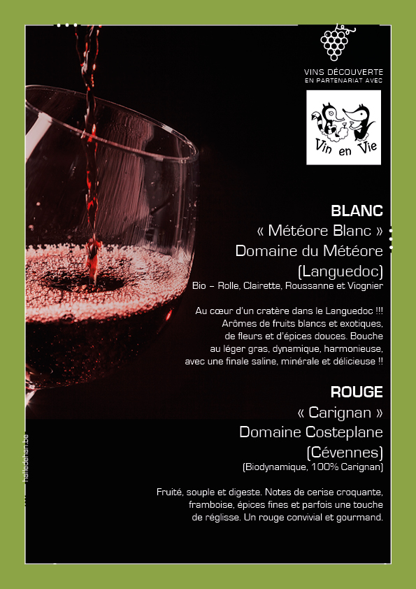 En collaboration avec Vin en Vie (Virton), nous proposons régulièrement de nouveaux vins rouges et blancs à partager au verre ou en bouteille. Souvent naturels ou biodynamiques, loin des clichés vinicoles, ces breuvages goûtent le respect de la terre et cultivent nos papilles !
