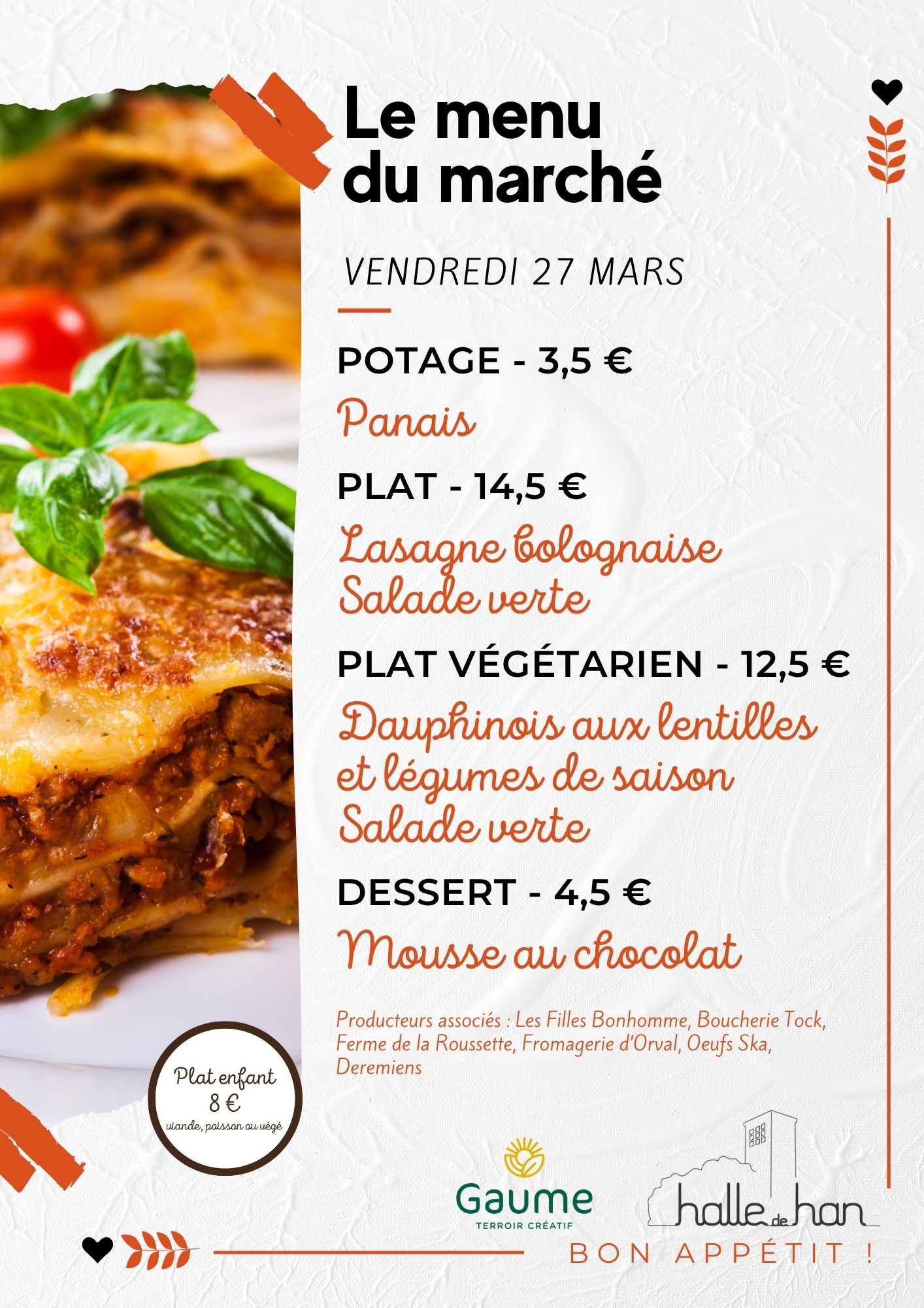 Le Marché de la Halle de Han (Tintigny) invite chaque semaine des producteurs locaux à rencontrer leurs clients en circuit court. Durant le marché, notre Entreprise de formation par le travail (EFT) propose un menu, à déguster dans la partie restaurant ou à emporter, réalisé par les stagiaires en formation, avec des produits locaux.