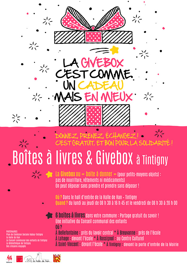 Quand vous passez par la Halle, par exemple quand vous vous rendez au marché, pensez à alimenter et/ou à vous servir dans la Givebox !